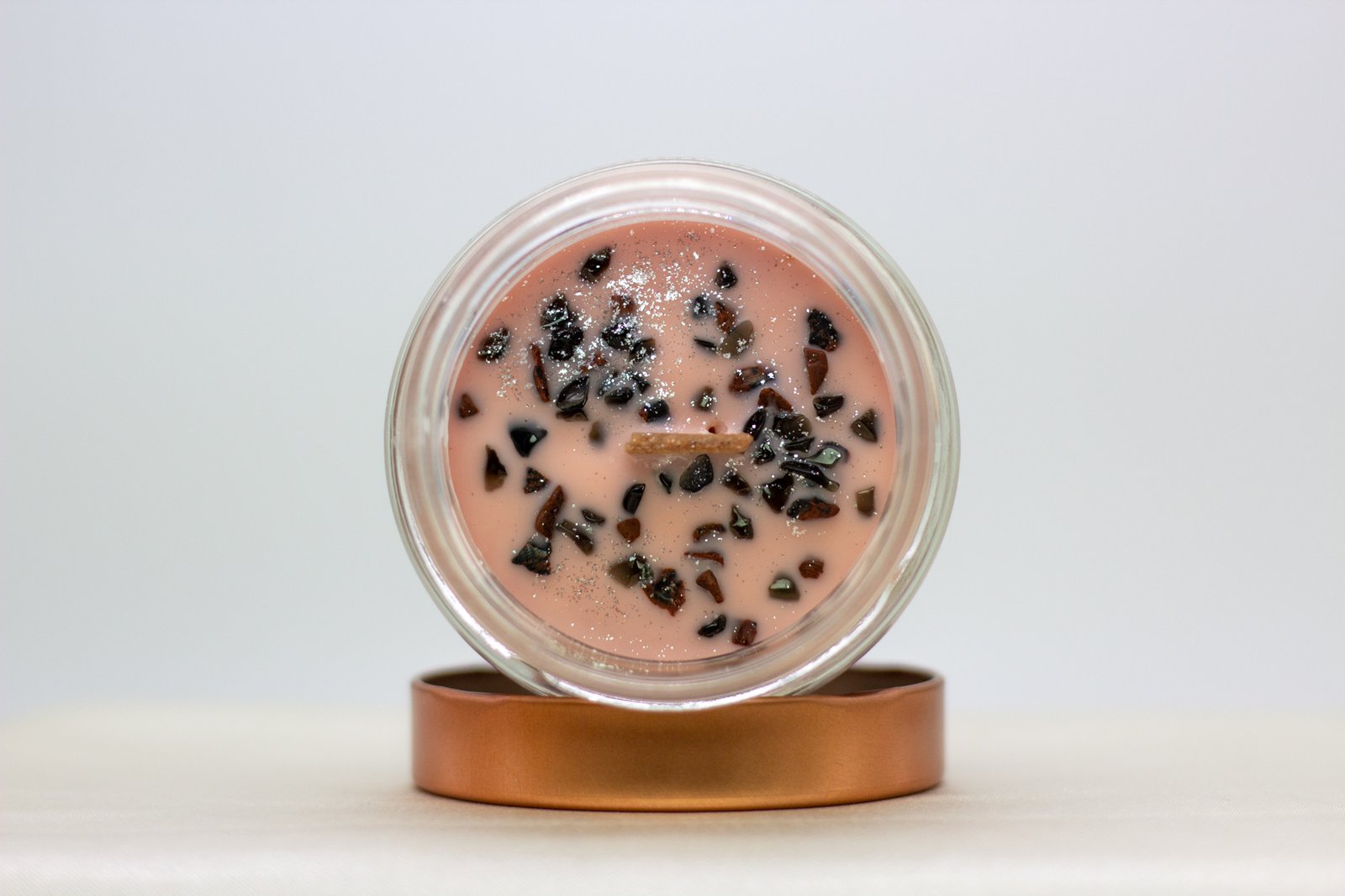 A viasz felolvadást követően gyönyörű csillámokban fog sziporkázni. A csillámló hatást természetes ásványi színezékkel értem el. Az összes alapanyag amit felhasználok a gyertyákhoz természetes és vegán.